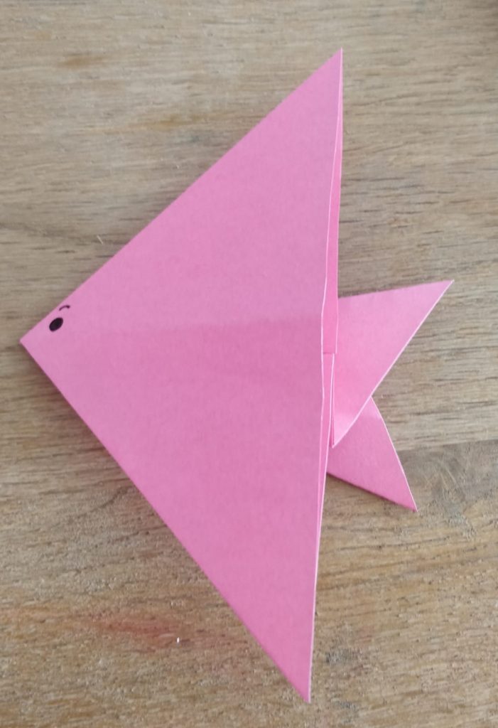 Step 12- Now, fold the opposite half back again. And lastly, turn it over and draw eyes on your fish. And now your fish is finished!