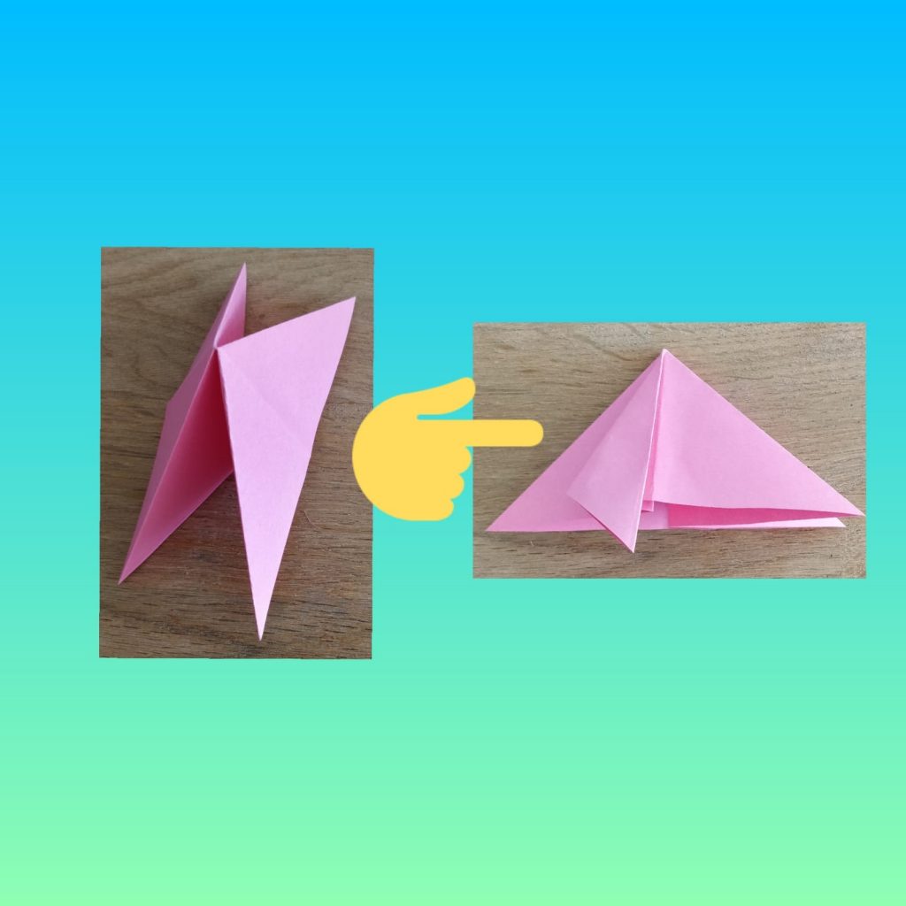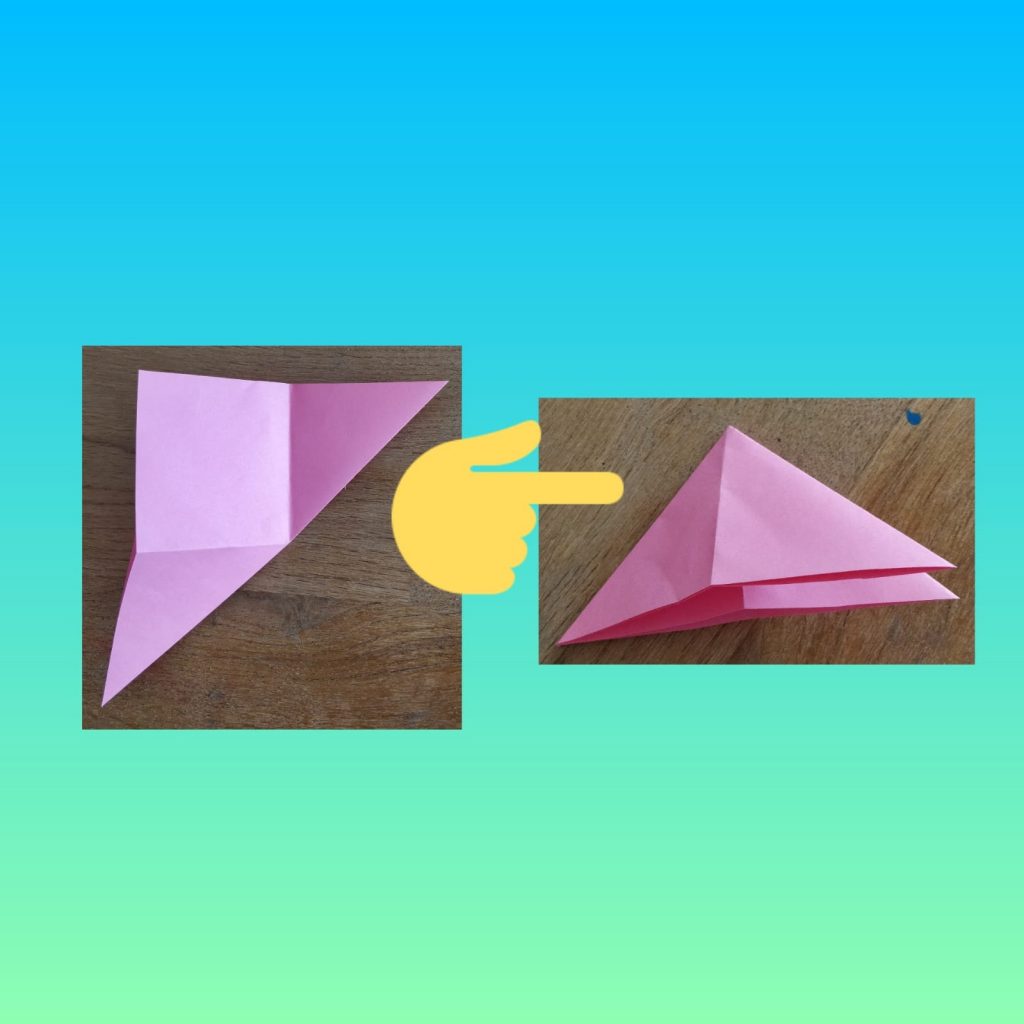 Step 7- After you have done that, fold 1 half of the triangle down. The other triangle should not be folded.